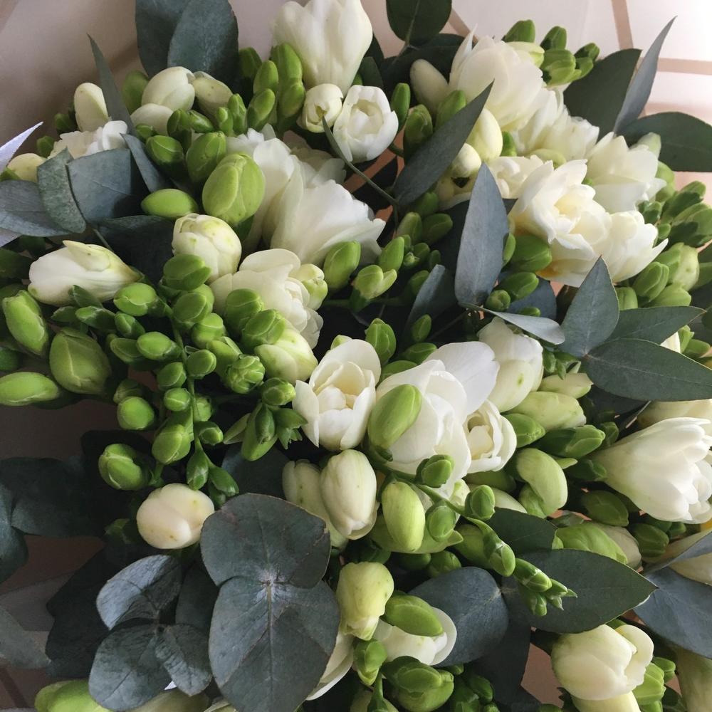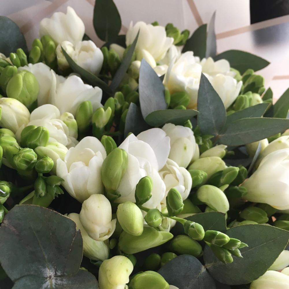 Белая фрезия с эвкалиптом