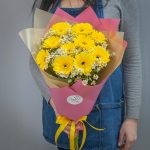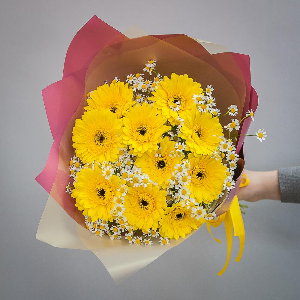 Букет из 11 желтых гербер и 15 ромашек кустовых