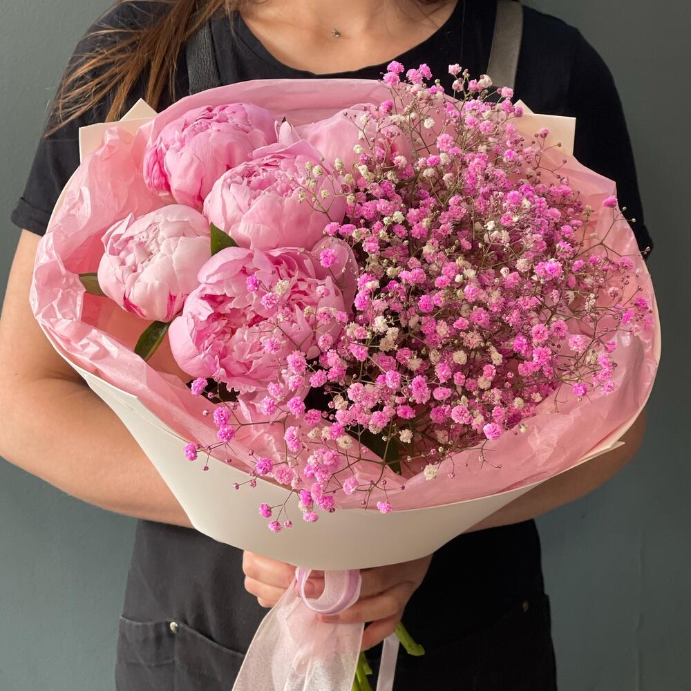 Гипсофила – 2 шт.Лента – 1 шт.Пион – 5 шт.Упаковка – 1 шт.