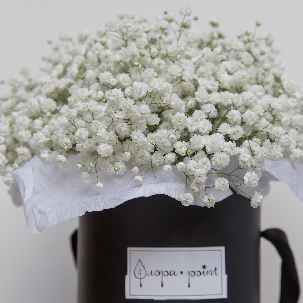 Гипсофила – 8 шт.Коробка шляпная – 1 шт.Оазис – 1 шт.