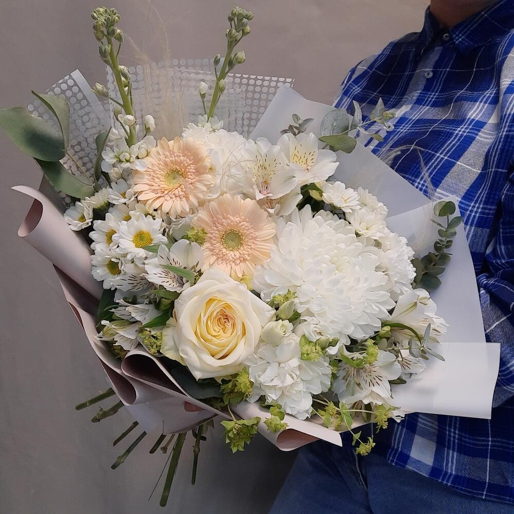 Роза – 1 шт.Гермини – 2 шт.Альстромерия – 3 шт.Сантини – 2 шт.Маттиола белая – 2 шт.Буплерум – 2 шт.Лизиантус – 1 шт.Диантус – 3 шт.ковыль (пучок) – 3 шт.Эвкалипт Baby Blue – 3 шт.Рускус – 12 шт.Упаковка дизайнерская – 2 шт.Лента атласная – 1 шт.антонов – 1 шт.