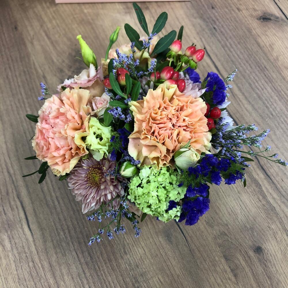 Диантус – 3 шт.Кустовая хризантема – 1 шт.Лимониум – 1 шт.Статица синяя – 1 шт.Гиперикум – 2 шт.Лизиантус – 1 шт.кружка керамика – 1 шт.Оазис флористический – 1 шт.пакет с окном – 1 шт.