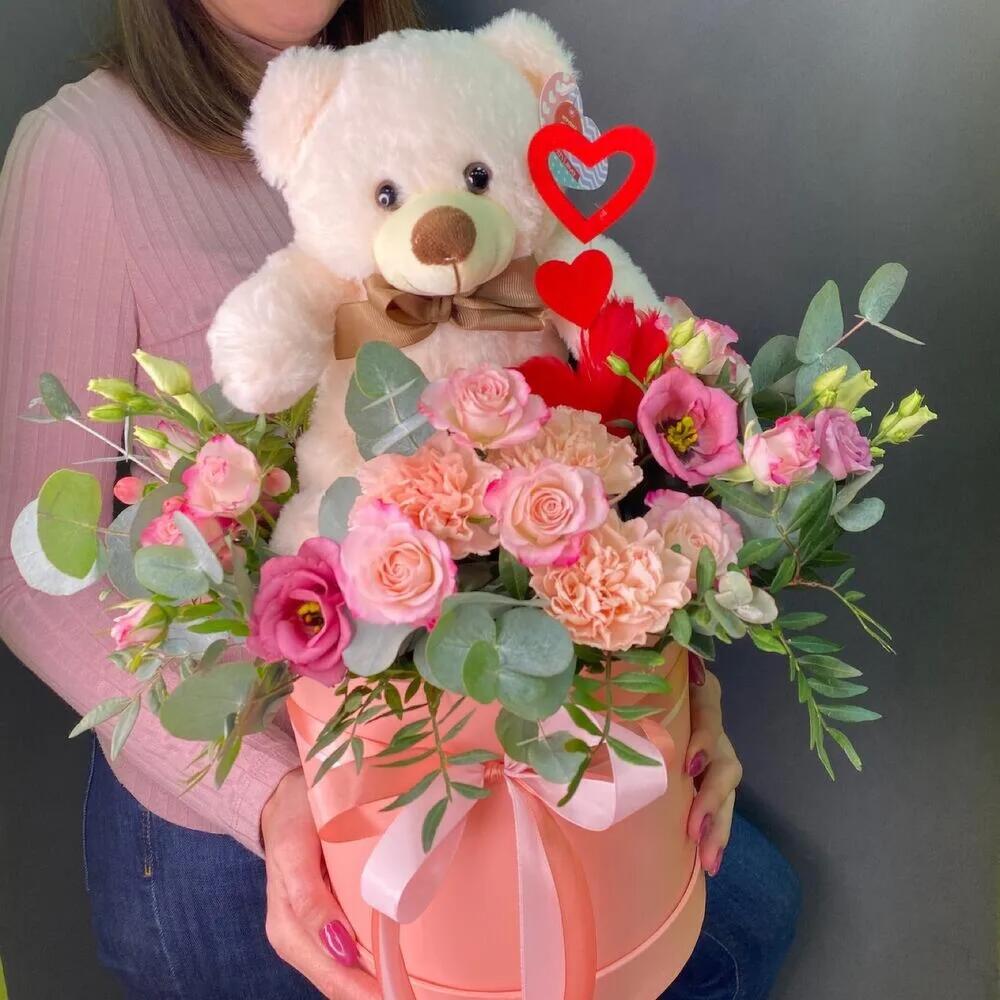 Шляпная коробка большая vip – 1 шт.Плюшевый медведь – 1 шт.Роза кустовая – 2 шт.Лизиантус – 1 шт.Альстромерия Микс Европа – 1 шт.Диантус – 3 шт.Гиперикум – 1 шт.Эвкалипт – 3 шт.