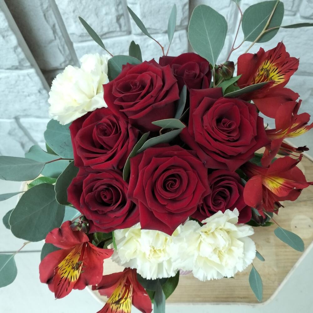 Роза Эквадор – 5 шт.Лента атласная – 1 шт.Гвоздика сортовая – 3 шт.Конус – 1 шт.Альстромерия Микс Европа – 1 шт.Эвкалипт Микс – 3 шт.