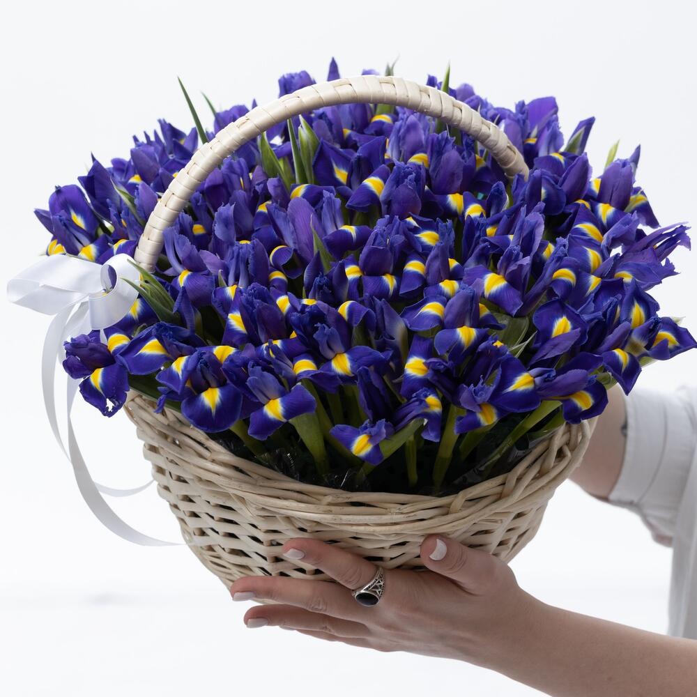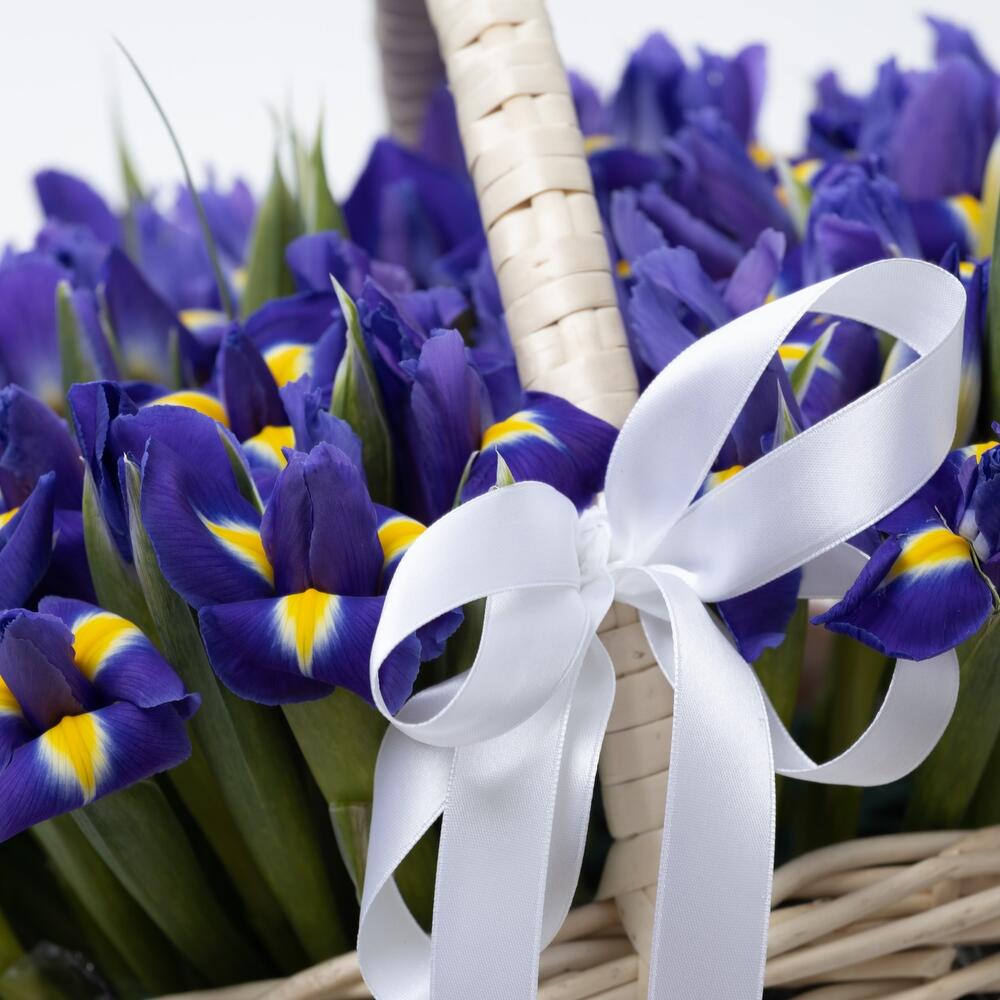 Ирис – 51 шт.Корзина плетеная – 1 шт.Лента атласная – 1 шт.Открыточка с вашими пожеланиями – 1 шт.хорошее настроение – 100 шт.инструкция по уходу за цветами – 1 шт.Кризал – 1 шт.
