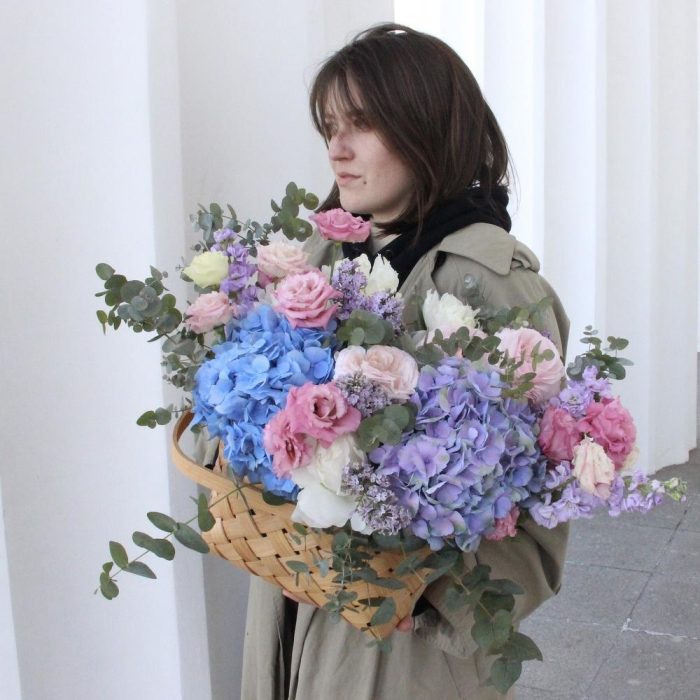 Гортензия – 2 шт.Лизиантус – 7 шт.Маттиола – 5 шт.Пион – 9 шт.Эвкалипт – 13 шт.Флокс – 4 шт.Оазис флористический – 2 шт.Лукошко плетеное – 1 шт.
