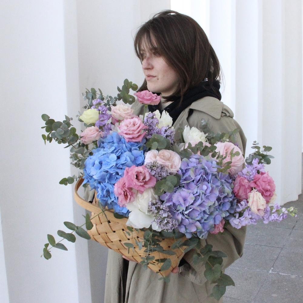 Акварельное лукошко с пионами, ранункулюсами и гортензиями