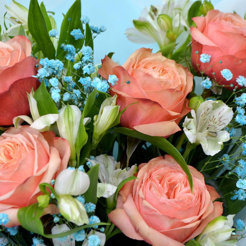 Альстромерия – 5 шт.Гипсофила – 3 шт.Лизиантус – 3 шт.Стильная упаковка – 1 шт.розы пионовидные – 5 шт.