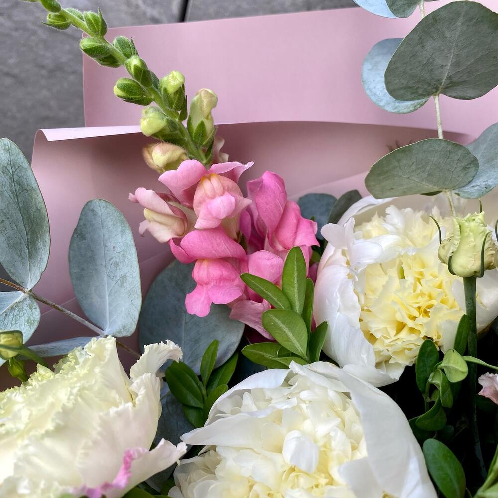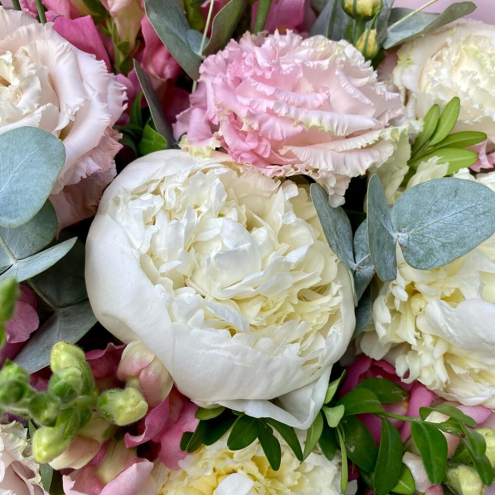 Маттиола – 7 шт.Эвкалипт – 5 шт.Лента атласная – 1 шт.Самшит – 8 шт.Пион белый Дюшес – 5 шт.Дизайнерская упаковка – 4 шт.лизиантус розовый махровый – 5 шт.
