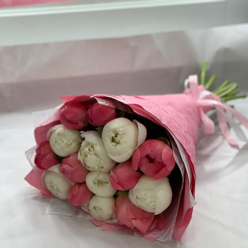Пион Коралл Шарм (Coral Charm) – 8 шт.Упаковка – 2 шт.Лента атласная – 1 шт.Пион белый – 7 шт.