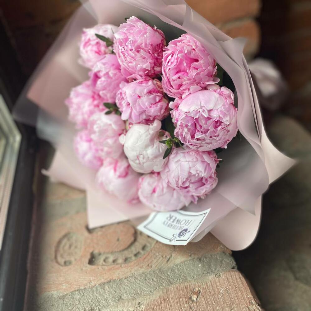 Букет из 13 розовых пионов с зеленью в дизайнерской упаковке “Принцесса Уэльская”