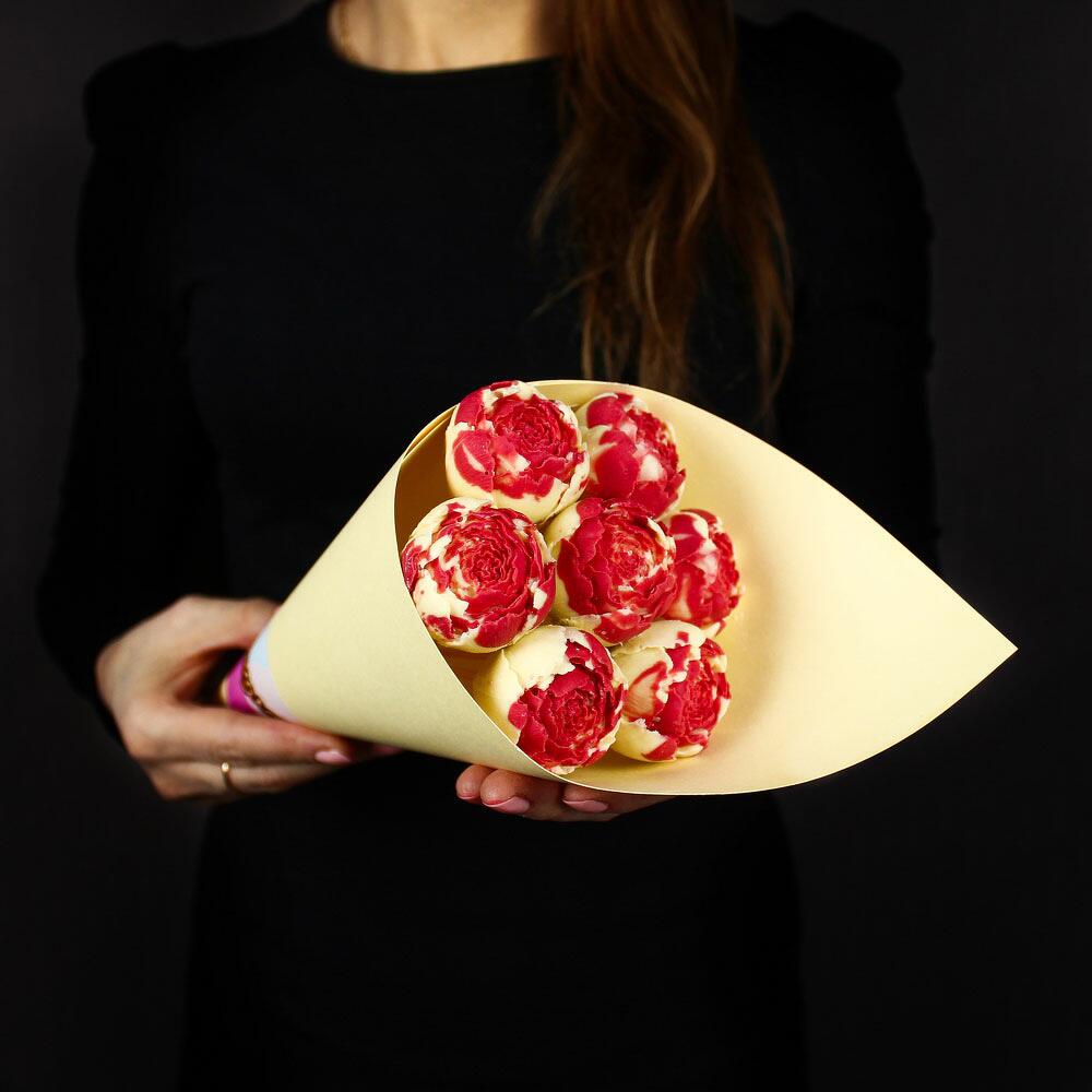 Упаковка Кулек – 1 шт.Прозрачная пленка – 1 шт.шоколадные пионы из бельгийского шоколада – 7 шт.