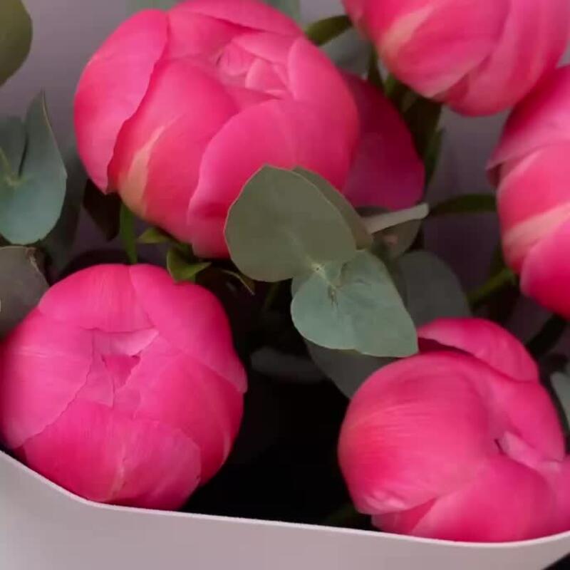 Пион коралл шарм – 5 шт.Эвкалипт – 1 шт.Упаковка дизайнерская – 1 шт.Лента атласная – 1 шт.