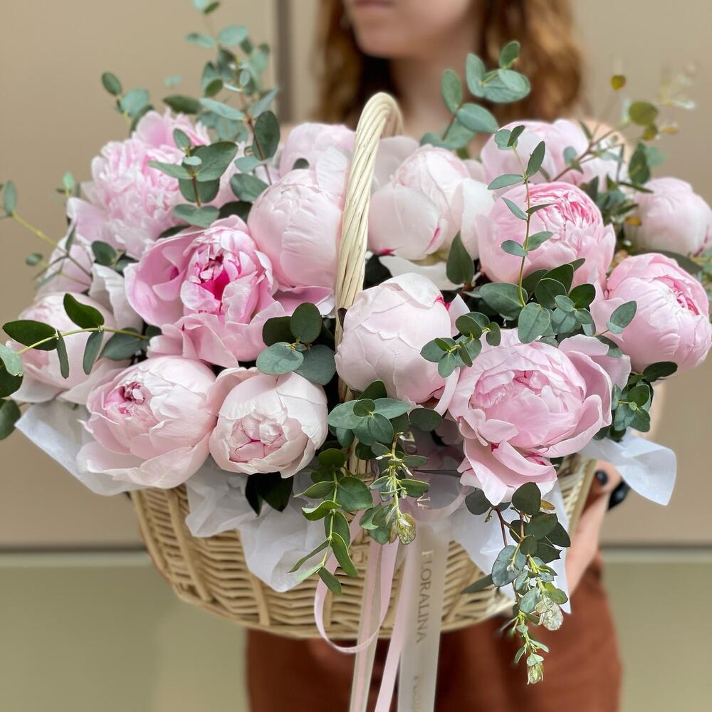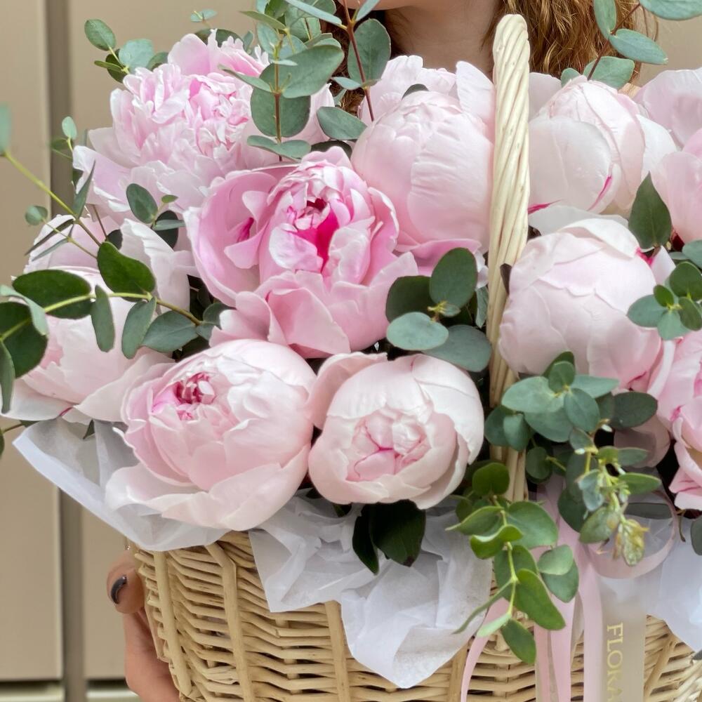 Корзина с пионами и эвкалиптом