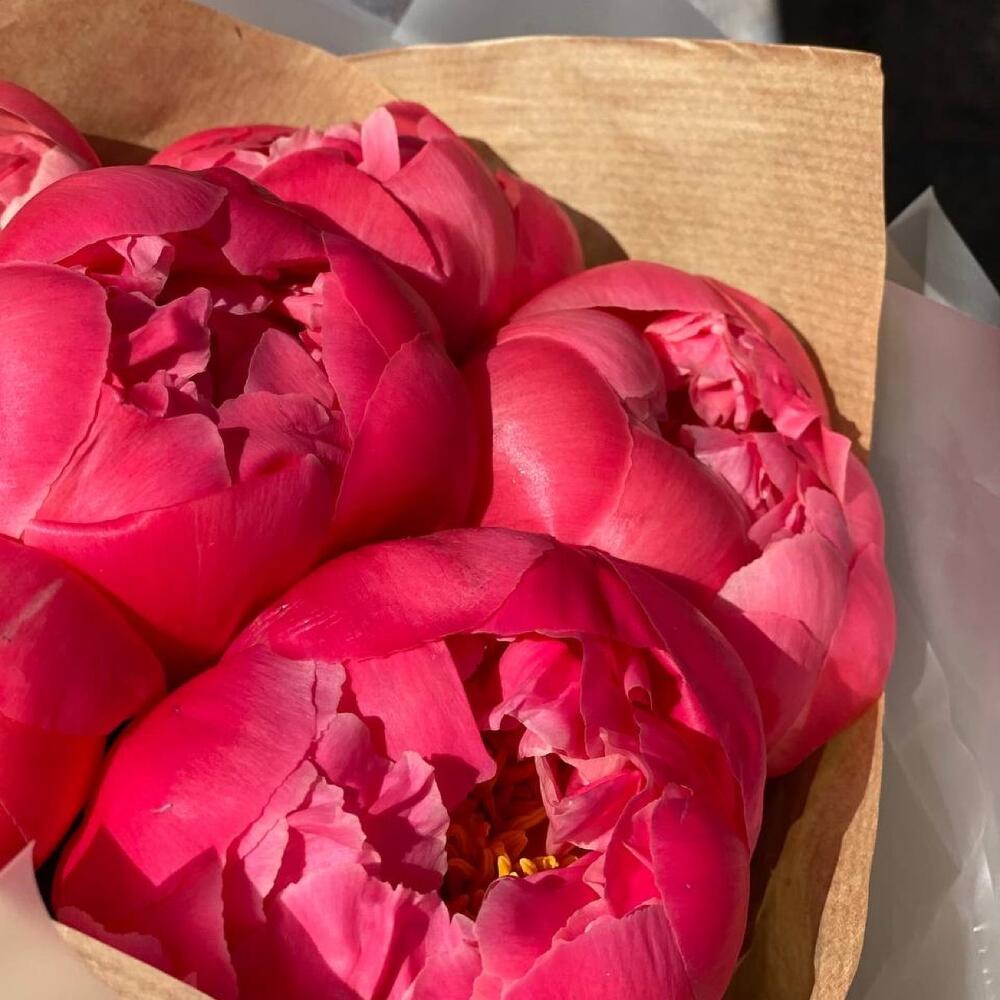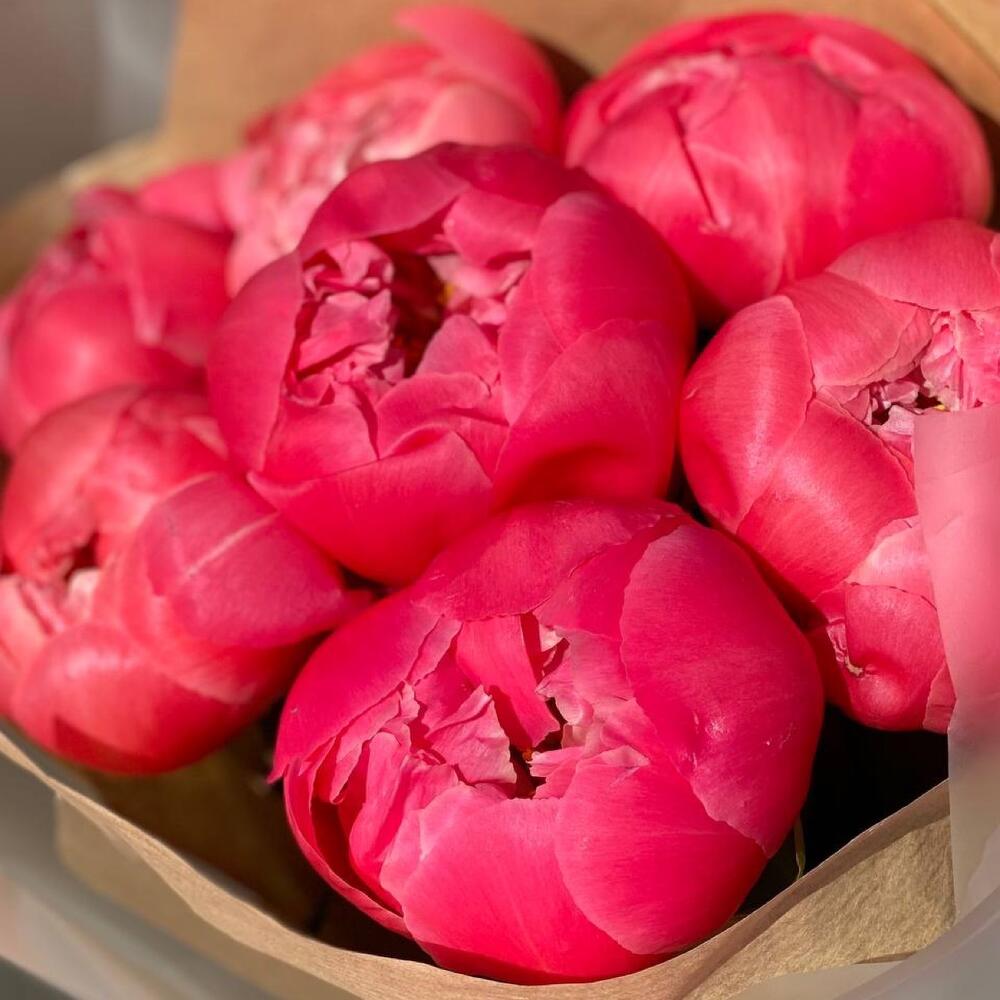 Подарочная упаковка – 1 шт.Средство продления жизни цветка – 1 шт.пионы coral charm – 7 шт.