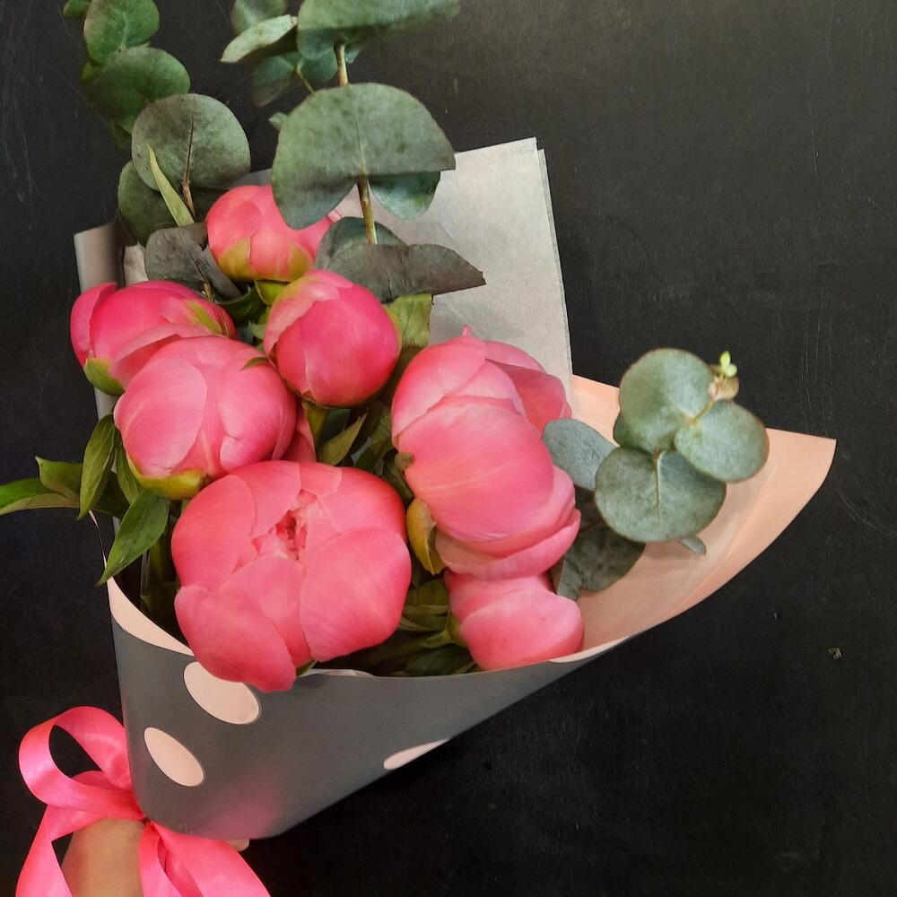 Букет из 7 коралловых пионов и ароматного эвкалипта в дизайнерской упаковке