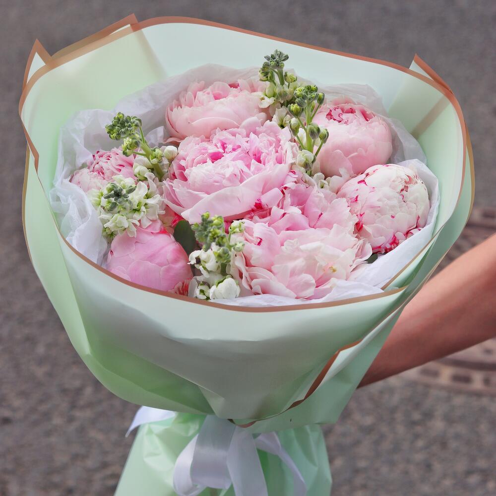 Маттиола – 5 шт.Пион – 7 шт.Открыточка с вашими пожеланиями – 1 шт.Шоколадка – 1 шт.Транспортировочная коробка – 1 шт.Дизайнерская упаковка – 1 шт.подкормка для срезанных цветов – 1 шт.инструкция по уходу за цветами – 1 шт.