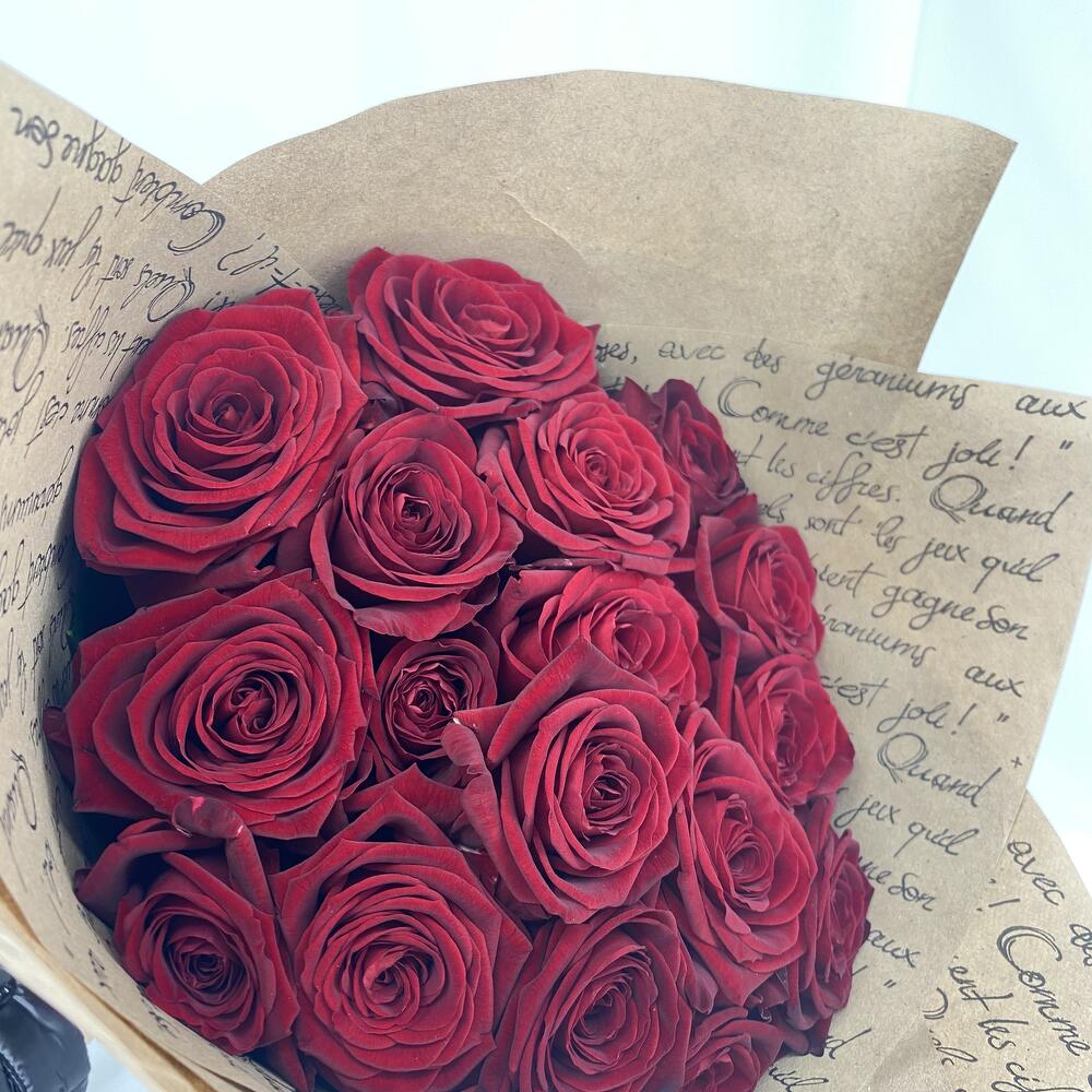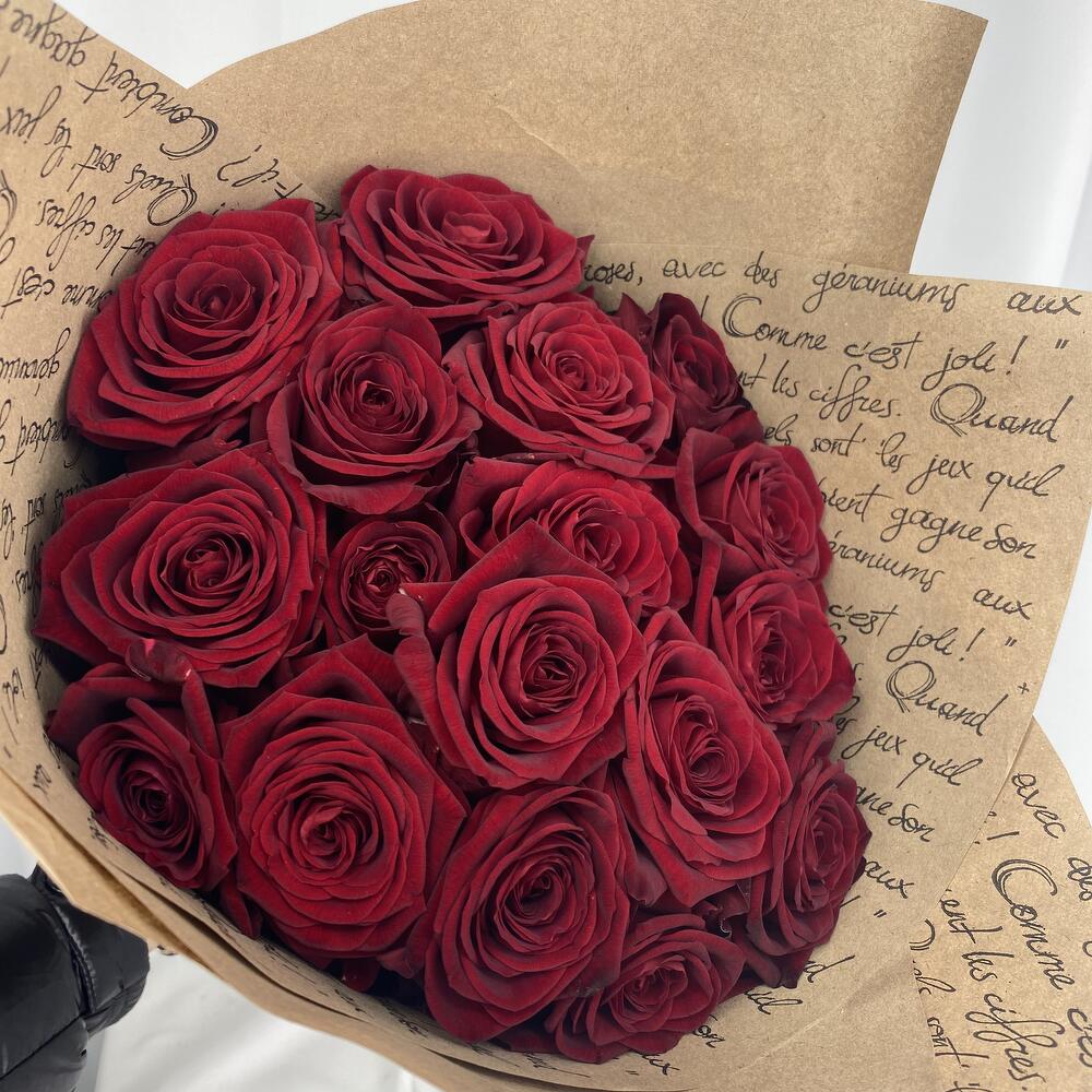 Роза 60 см – 15 шт.Крафт-упаковка – 3 шт.Атласная лента – 1 шт.