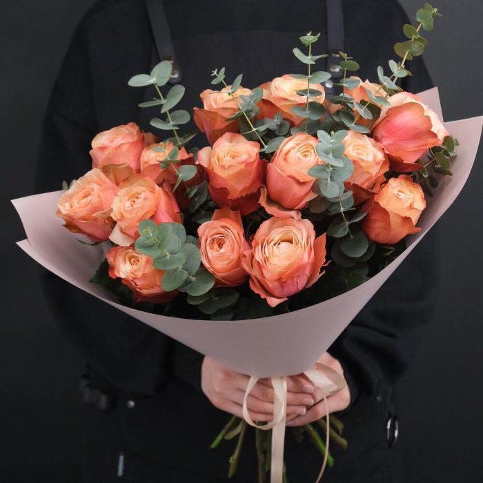 Эвкалипт – 3 шт.Роза пионовидная – 15 шт.Упаковка дизайнерская – 1 шт.Лента атласная – 1 шт.