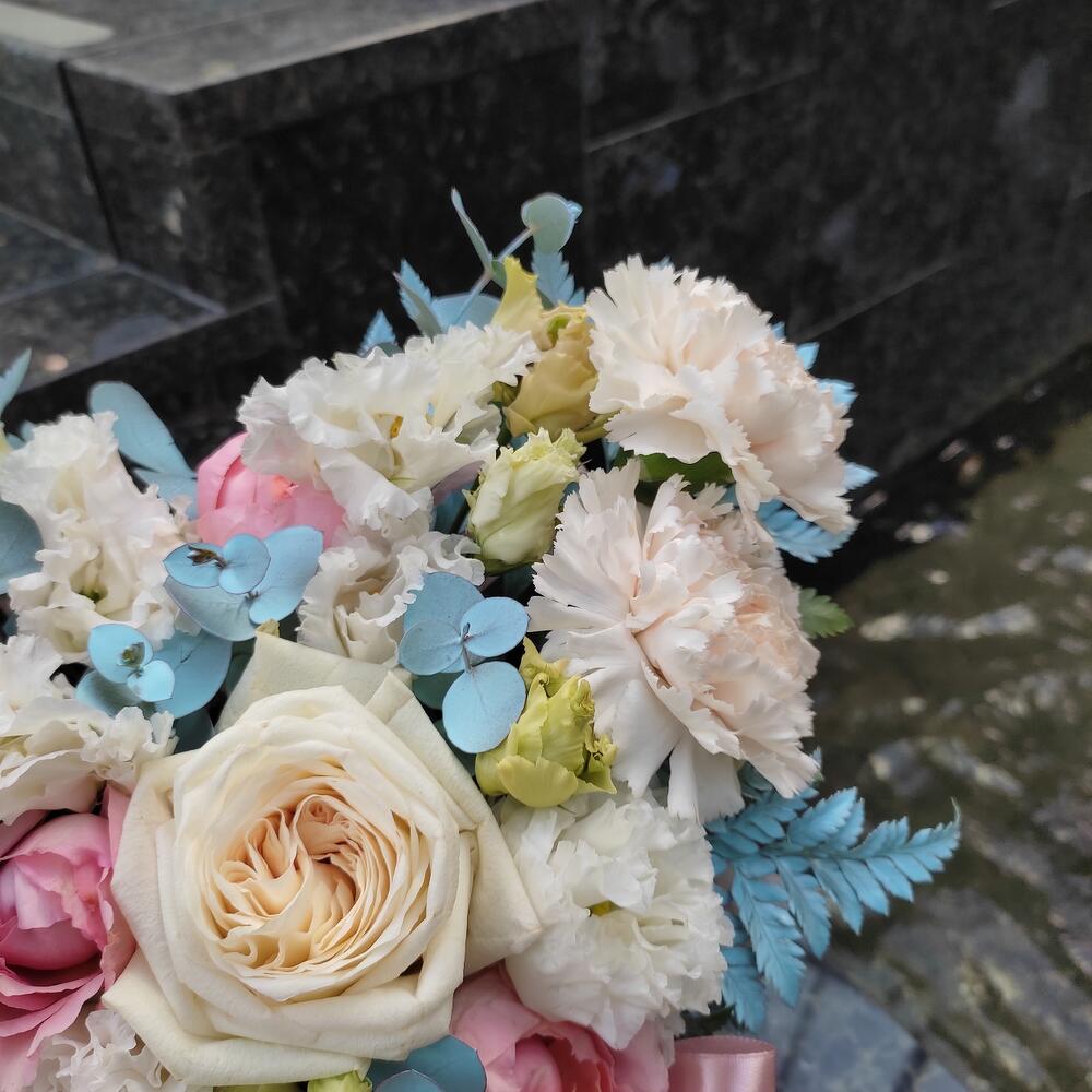 Роза кустовая – 2 шт.Гвоздика – 2 шт.эустома белая – 2 шт.Папоротник – 1 шт.Оазис флористический – 1 шт.Коробка – 1 шт.