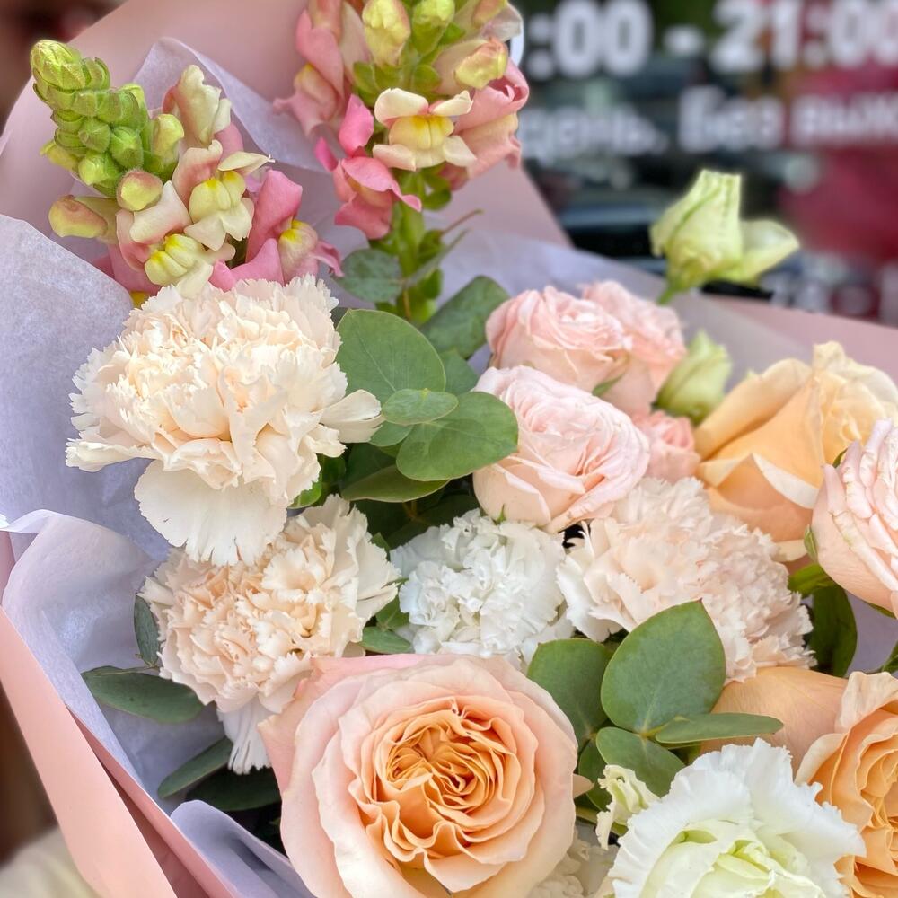 Лента атласная – 1 шт.Кустовая роза Бомбастик – 2 шт.Упаковка дизайнерская – 4 шт.Эвкалипт Микс – 3 шт.Роза шиммер – 3 шт.Диантус сортовой – 3 шт.антиринум – 2 шт.эустома алиса белая – 1 шт.