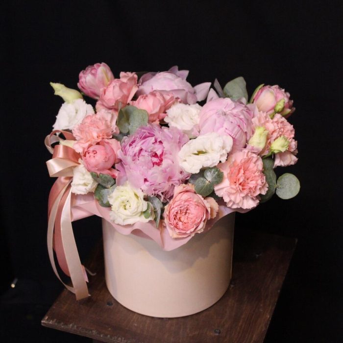 Эвкалипт – 1 шт.Эустома – 2 шт.Лента атласная – 1 шт.Диантус – 3 шт.Шляпная коробка – 1 шт.Пион Сара Бернар – 3 шт.Оазис флористический – 1 шт.Пленка дизайнерская – 1 шт.Роза кустовая пионовидная джульетта – 1 шт.тюльпан пионовидный фокстрот – 2 шт.