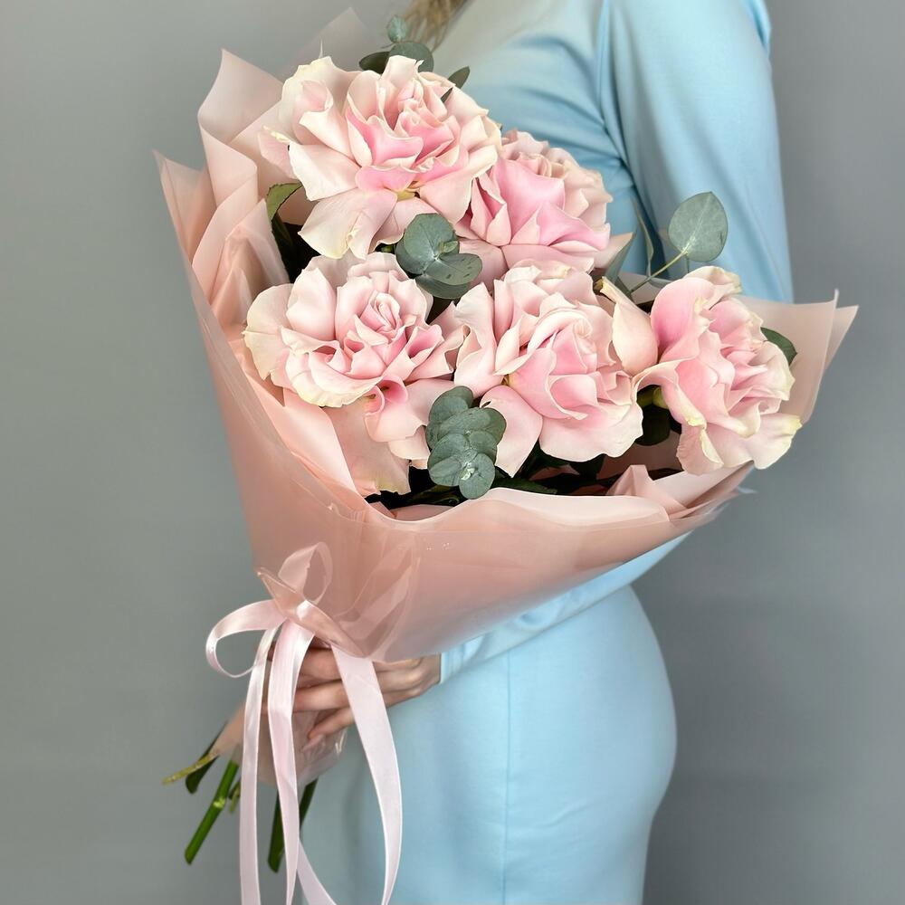 Лента атласная – 1 шт.Французская роза – 5 шт.Дизайнерская упаковка – 1 шт.эвкалипт цинерея пучок – 1 шт.влагостойкий тишью – 1 шт.
