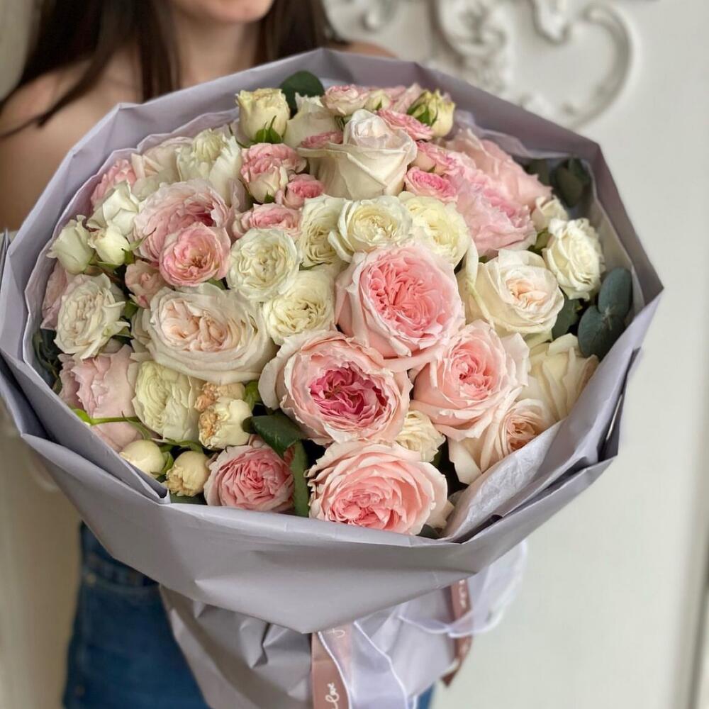 садовая роза хитоми – 5 шт.садовая роза цумуги – 4 шт.пионовидная роза white o’hara – 5 шт.кустовая роза жанин – 5 шт.кустовые розы микс – 5 шт.Эвкалипт – 5 шт.