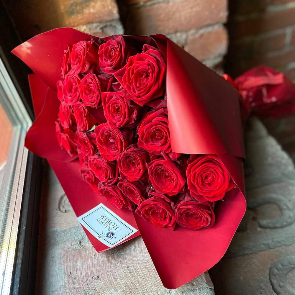 Букет из 25 красных роз в стильной упаковке “Взрывной красный”