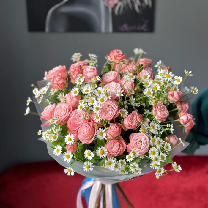 Кустовая роза Бомбастик – 6 шт.Атласная лента – 3 шт.Ромашка матрикария – 5 шт.Дизайнерская упаковка – 1 шт.
