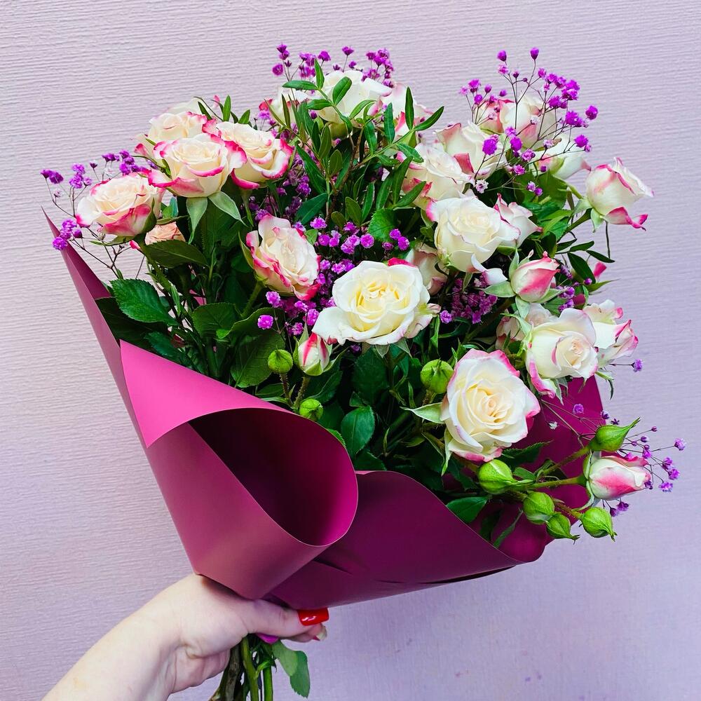 Букет из кустовых роз с гипсофилой