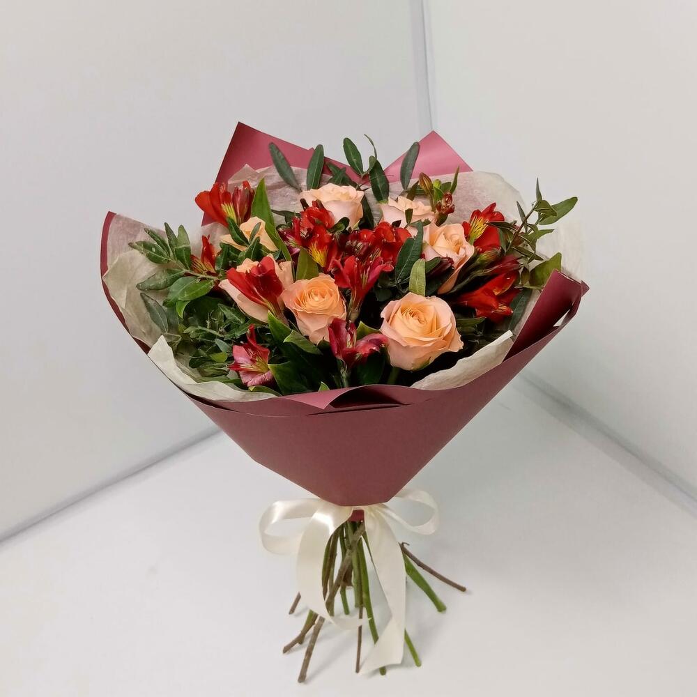 Альстромерия – 4 шт.Дизайнерская упаковка – 1 шт.роза кения – 7 шт.