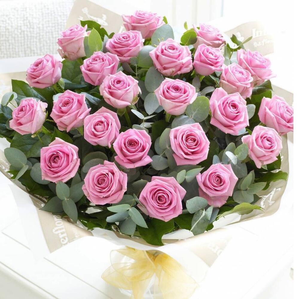 Лента – 1 шт.Эвкалипт – 5 шт.Подарочная упаковка – 1 шт.Роза розовая 50 см – 25 шт.