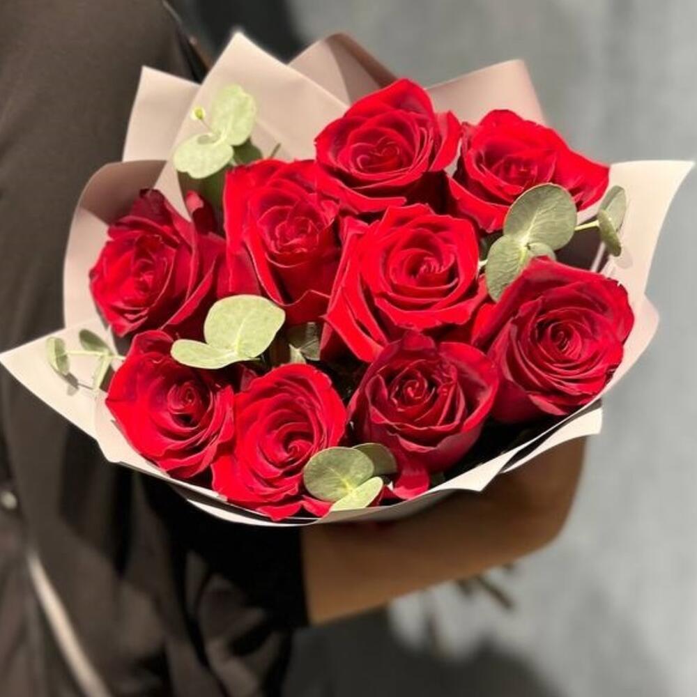 Букет красных Роз с эвкалиптом
