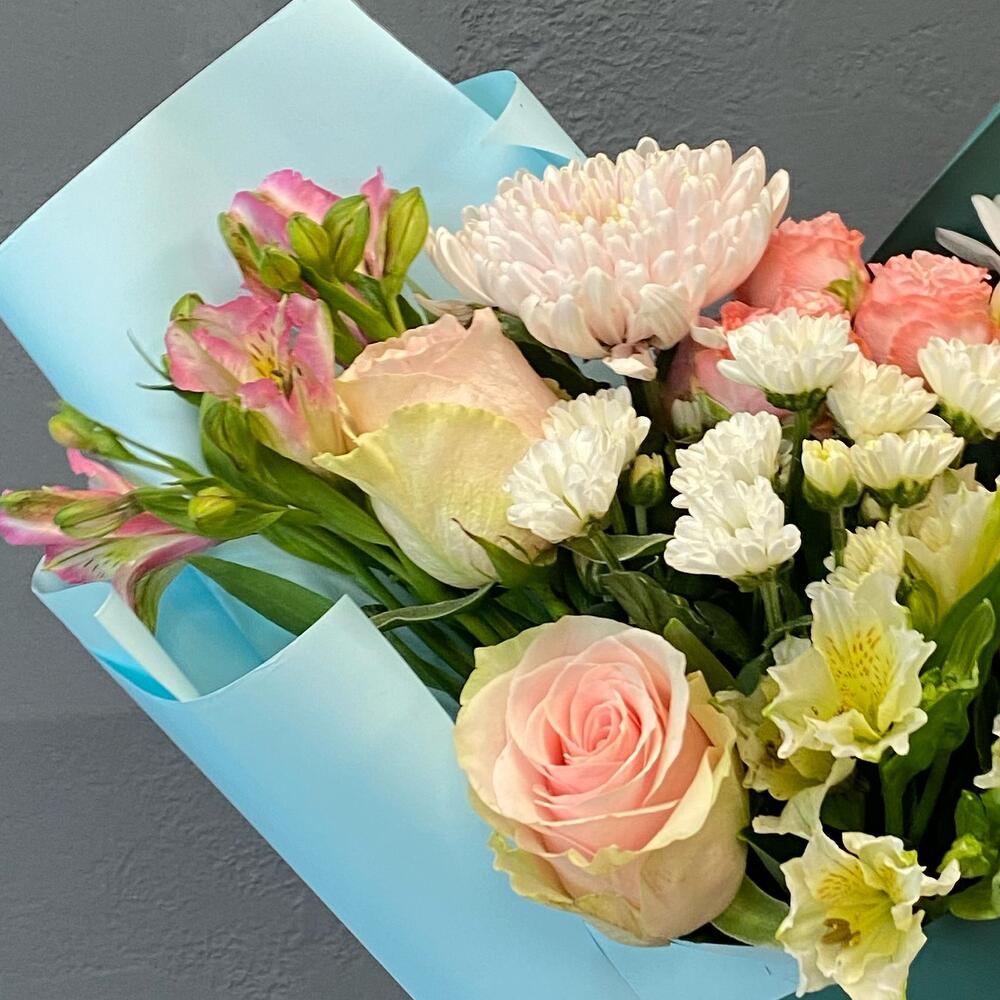 Альстромерия – 2 шт.Роза кустовая – 1 шт.Роза – 3 шт.Хризантема – 1 шт.Сантини – 1 шт.Упаковка дизайнерская – 2 шт.россана – 1 шт.