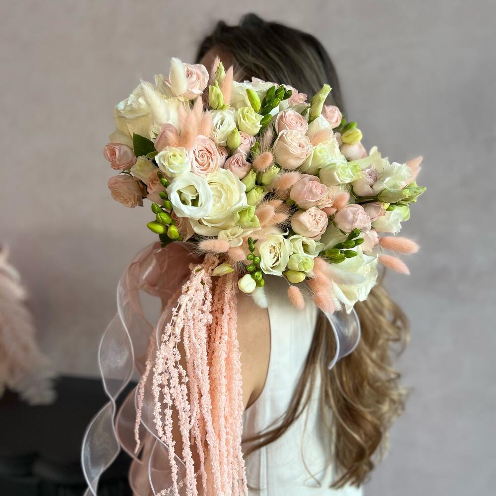 Пионовидная роза – 5 шт.Кустовая пионовидная роза – 11 шт.Лизиантус – 5 шт.фрезии – 5 шт.Лагурус – 30 шт.амарант стабилизированный – 1 шт.Лента атласная – 3 шт.