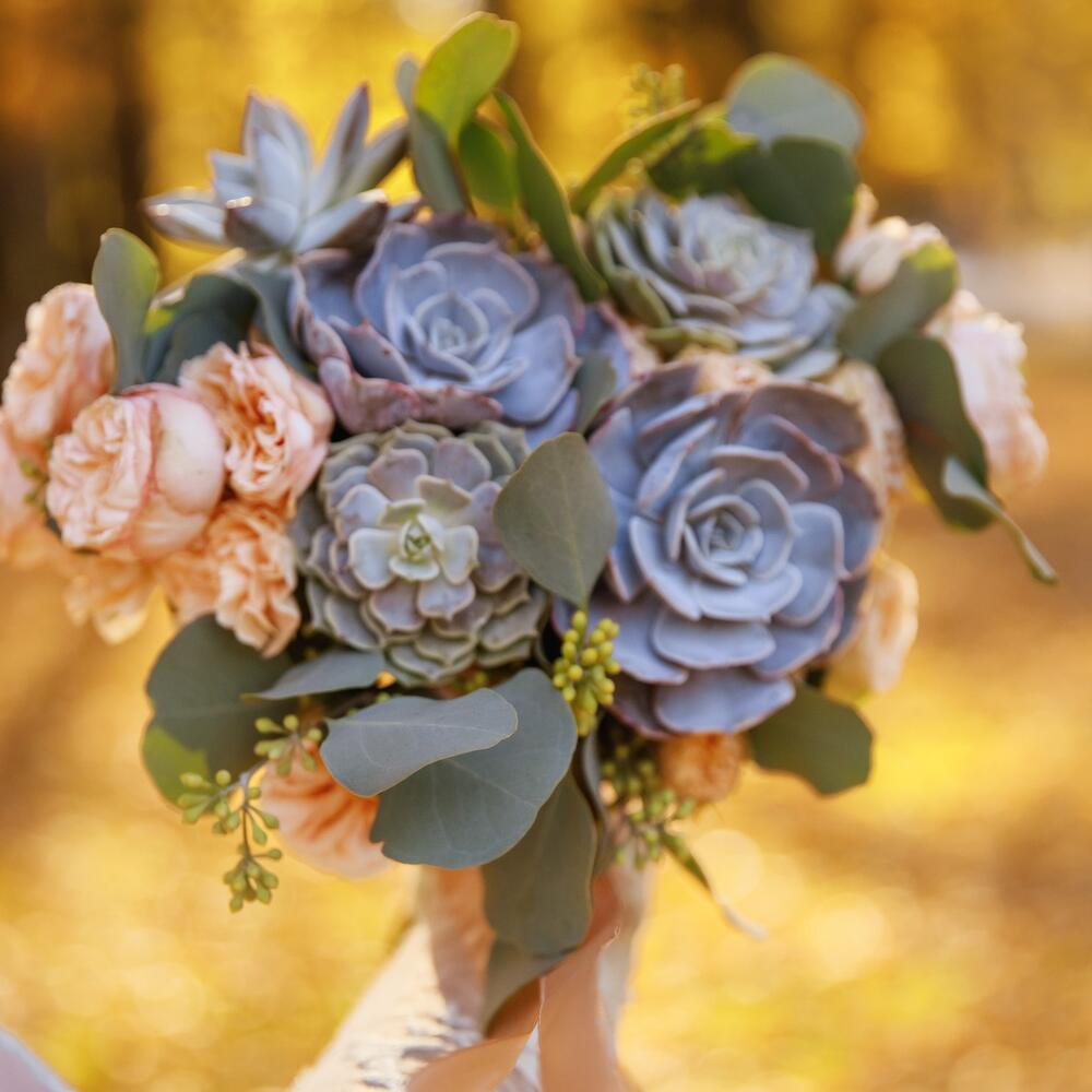 Суккулент – 5 шт.Пионовидная кустовая роза – 5 шт.Диантус – 7 шт.Эвкалипт – 5 шт.Лента атласная – 1 шт.