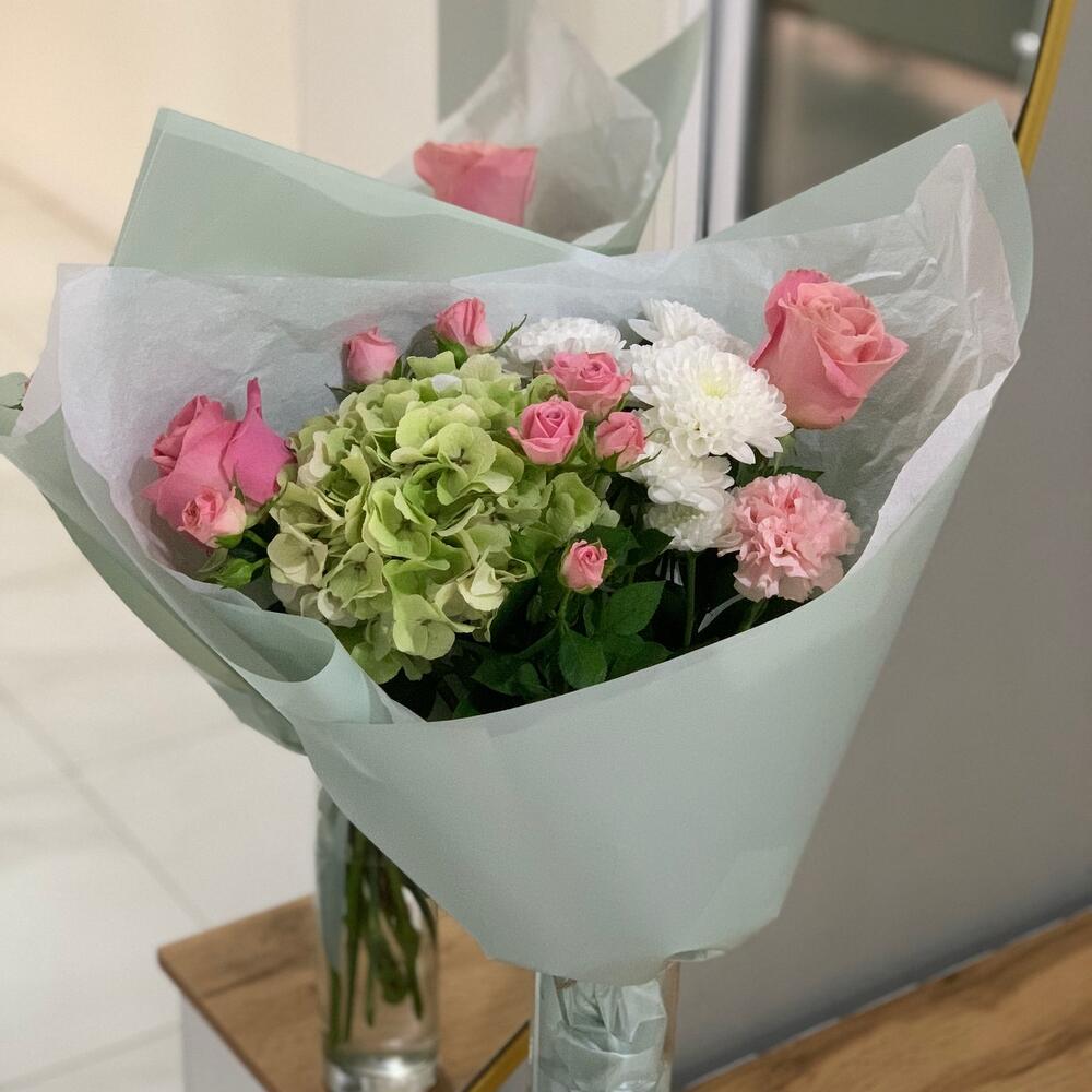 Альстромерии, Гвоздики, Кустовые розы, Лизиантусы, Розы, Хризантемы