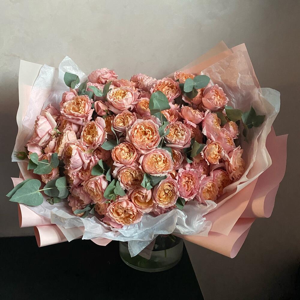 Кустовая пионовидная роза – 25 шт.Эвкалипт – 6 шт.Дизайнерская упаковка – 1 шт.Лента атласная – 1 шт.