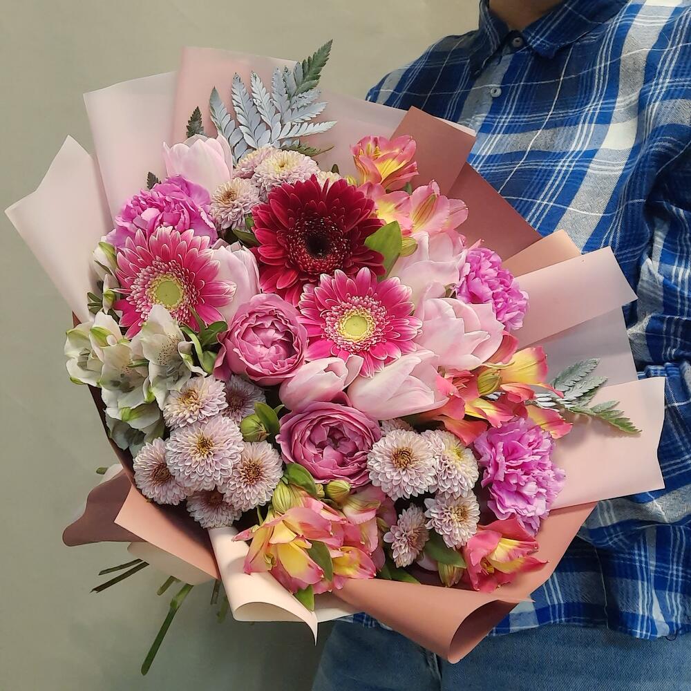Категорий: Альстромерии, Гвоздики, Кустовые розы, Пионовидные розы, Розы, Тюльпаны
