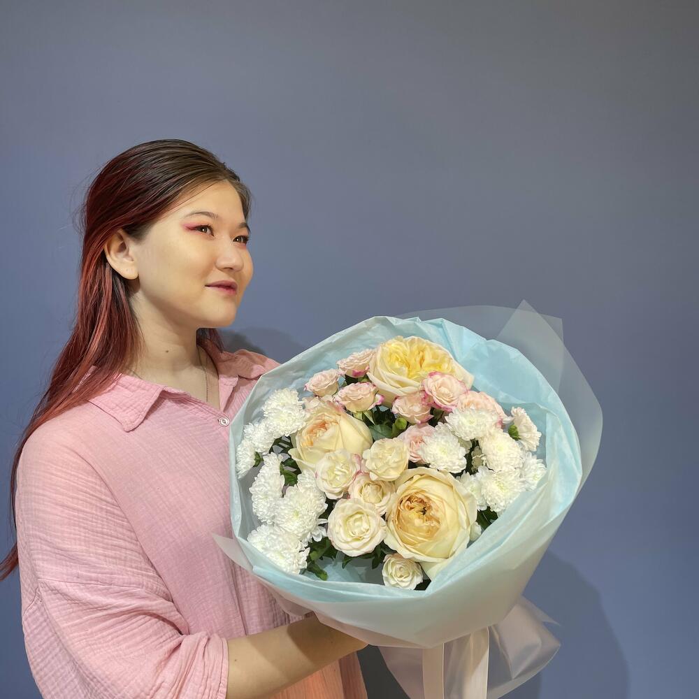 Альстромерии, Гвоздики, Кустовые розы, Лизиантусы, Розы, Хризантемы