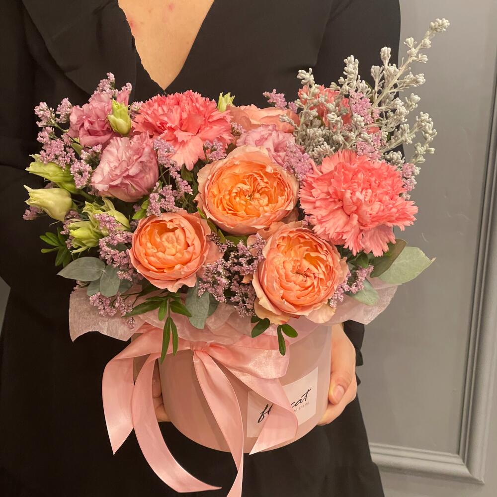 Роза пионовидная – 1 шт.Диантус – 3 шт.Эустома – 1 шт.Лимониум – 1 шт.оазия – 1 шт.Коробка – 1 шт.Эвкалипт – 2 шт.