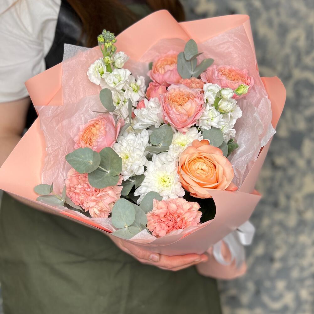 Роза кустовая пионовидная джульетта – 1 шт.Маттиола – 2 шт.Хризантема кустовая – 1 шт.Роза пионовидная кахала – 1 шт.Диантус – 3 шт.Эвкалипт – 3 шт.Тишью белое – 2 шт.Пленка матовая – 5 шт.Лента атласная – 2 шт.
