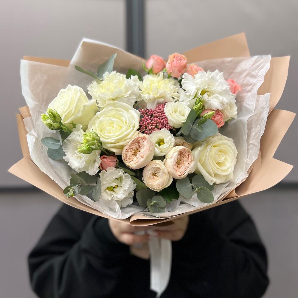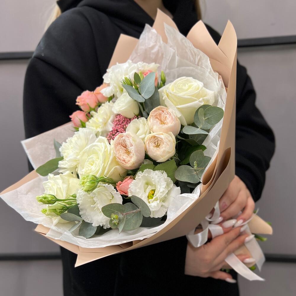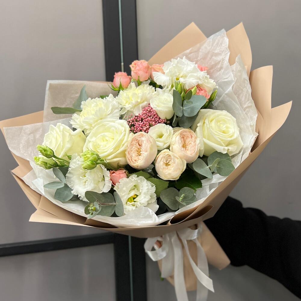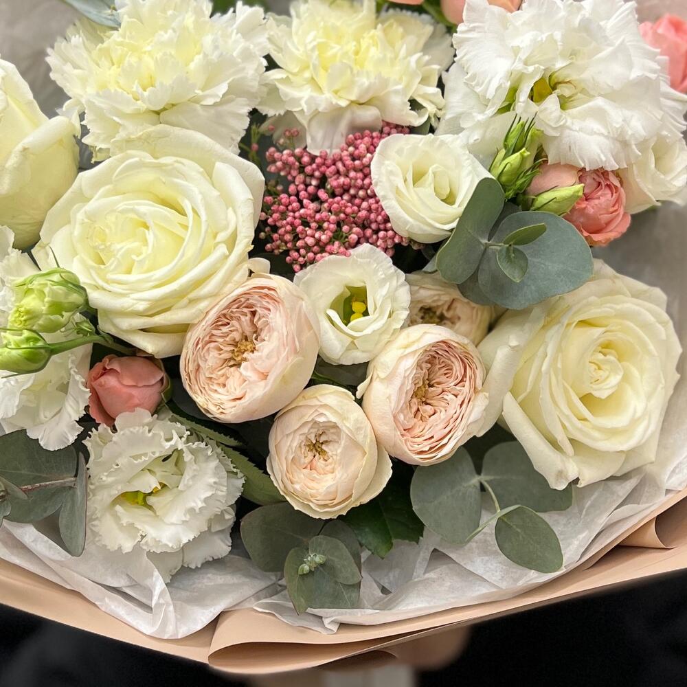 роза пионовидная плайа бланка – 3 шт.Роза кустовая пионовидная – 1 шт.роза кустовая мадам бомбастик – 1 шт.Озотамнус – 1 шт.Диантус – 2 шт.эустома махровая белая – 1 шт.эустома розита вайт – 1 шт.Эвкалипт – 2 шт.Тишью – 2 шт.Пленка матовая – 4 шт.Лента атласная – 2 шт.