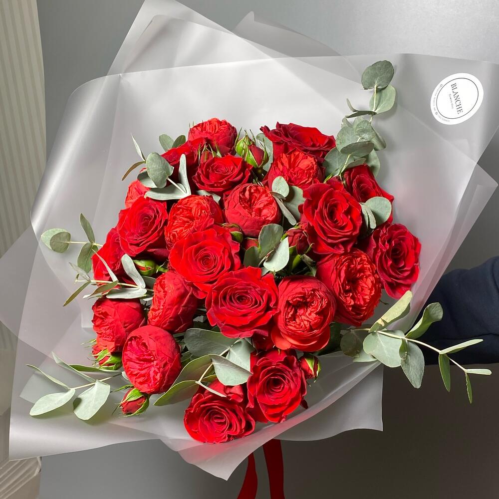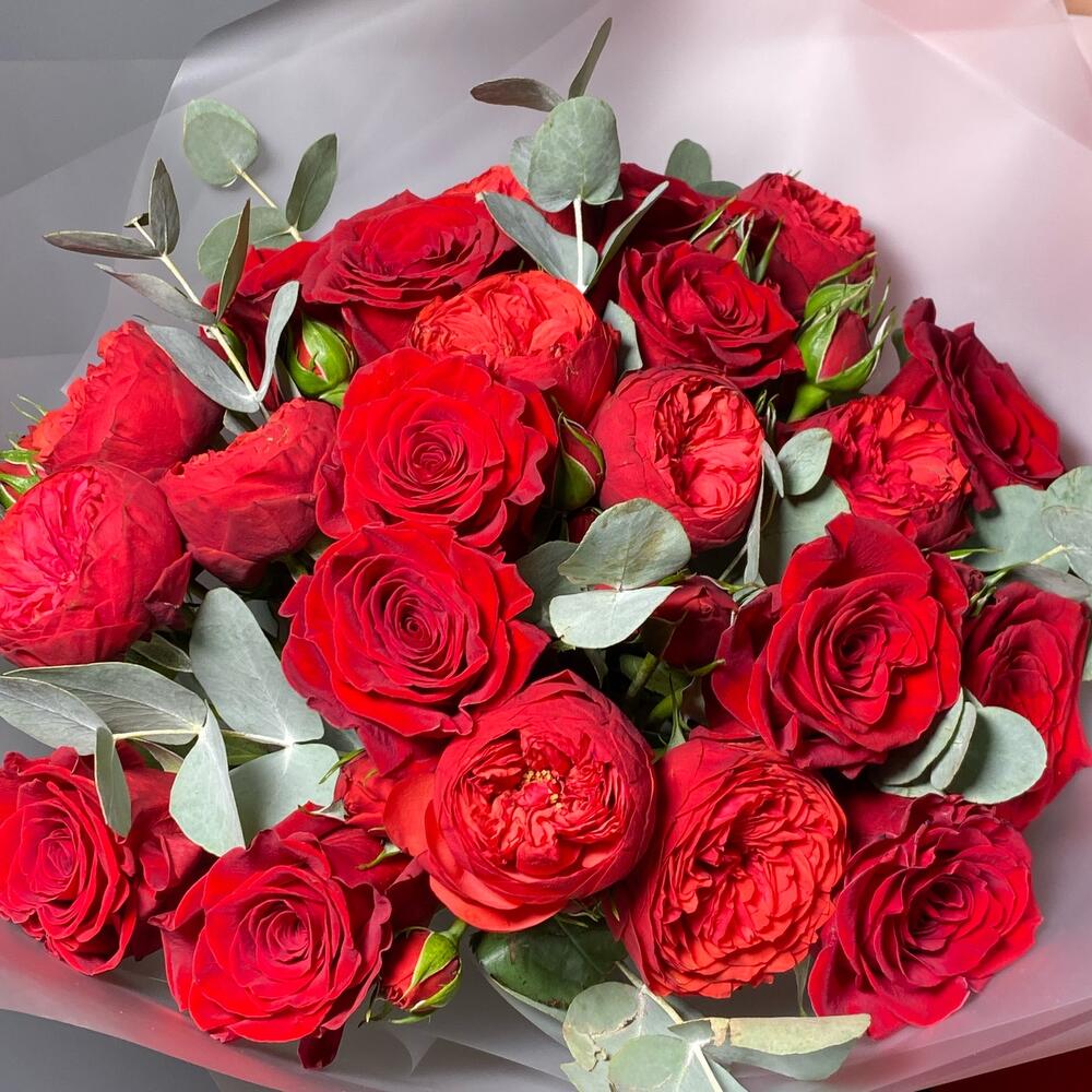 Эвкалипт – 5 шт.Роза Freedom – 12 шт.Фирменная упаковка – 1 шт.Роза red piano – 10 шт.