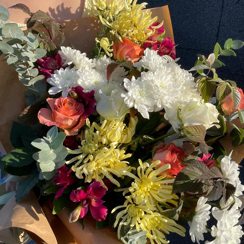 Альстромерии, Гвоздики, Кустовые розы, Лизиантусы, Розы, Хризантемы