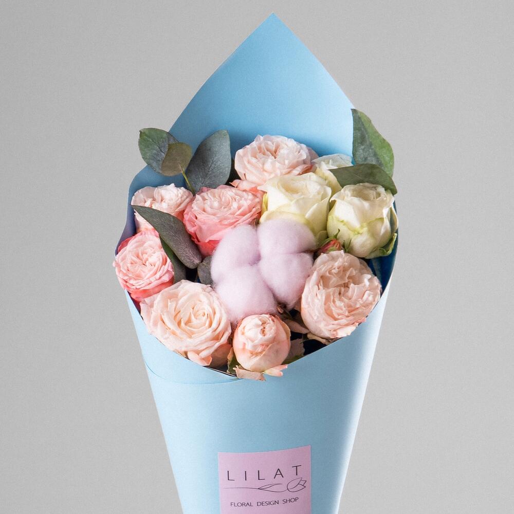 кустовые пионовидные розы – 11 шт. Оазис флористический – 1 шт. Упаковка дизайнерская – 1 шт. Открыточка с вашими пожеланиями – 1 шт.
