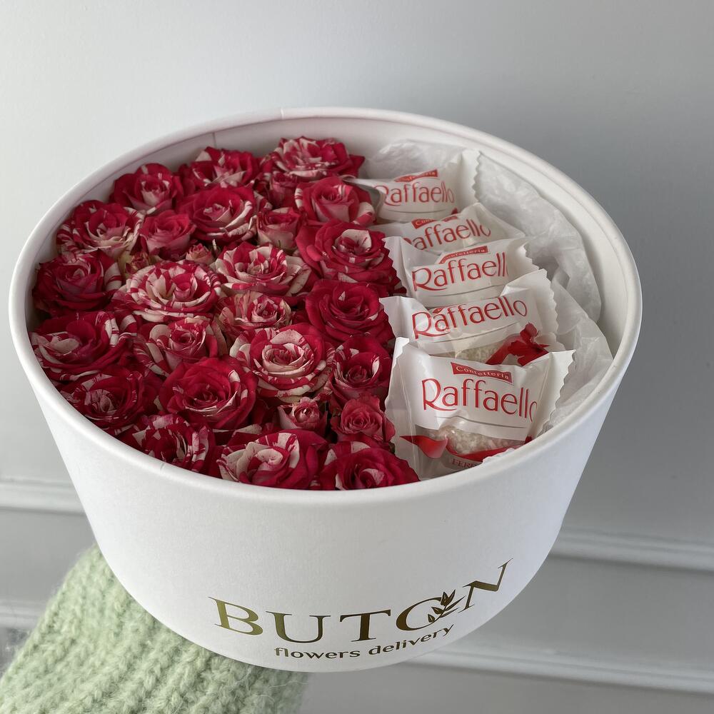 Роза кустовая – 3 шт.цилиндр плоский 21 см – 1 шт.Оазис флористический – 1 шт.Раффаэлло – 5 шт.