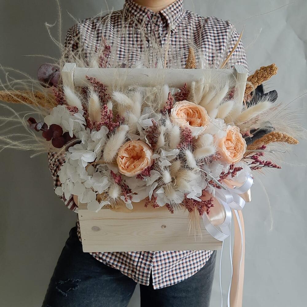 Лента атласная – 3 шт.Ящик деревянный – 1 шт.Оазис для сухоцветов – 1 шт.Эвкалипт стабилизированный – 4 шт.камыш декоративный – 4 шт.гортензия стабилизированная – 1 шт.ковыль связка – 4 шт.лагурус (сухоцвет) пучок – 3 шт.ветки декоративные – 10 шт.роза пионовидная стабилизированная – 3 шт.лимониум стабилизированный – 3 шт.