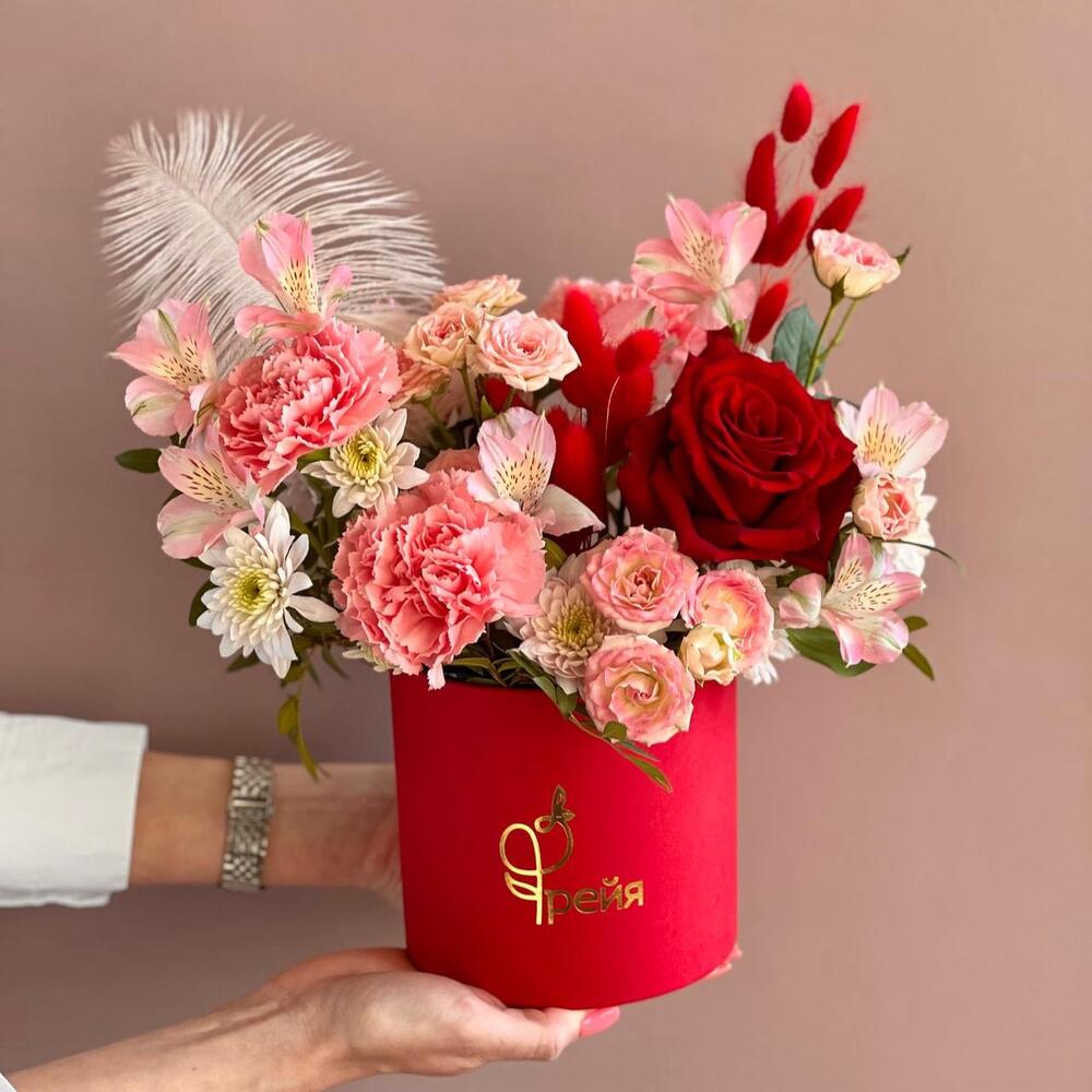 Альстромерия – 2 шт.Роза кустовая – 2 шт.Хризантема кустовая – 1 шт.Гвоздика – 3 шт.Фисташка – 2 шт.Роза Эксплорер – 1 шт.Коробка брендированная – 1 шт.Губка флористическая – 1 шт.лагурус пучок – 1 шт.